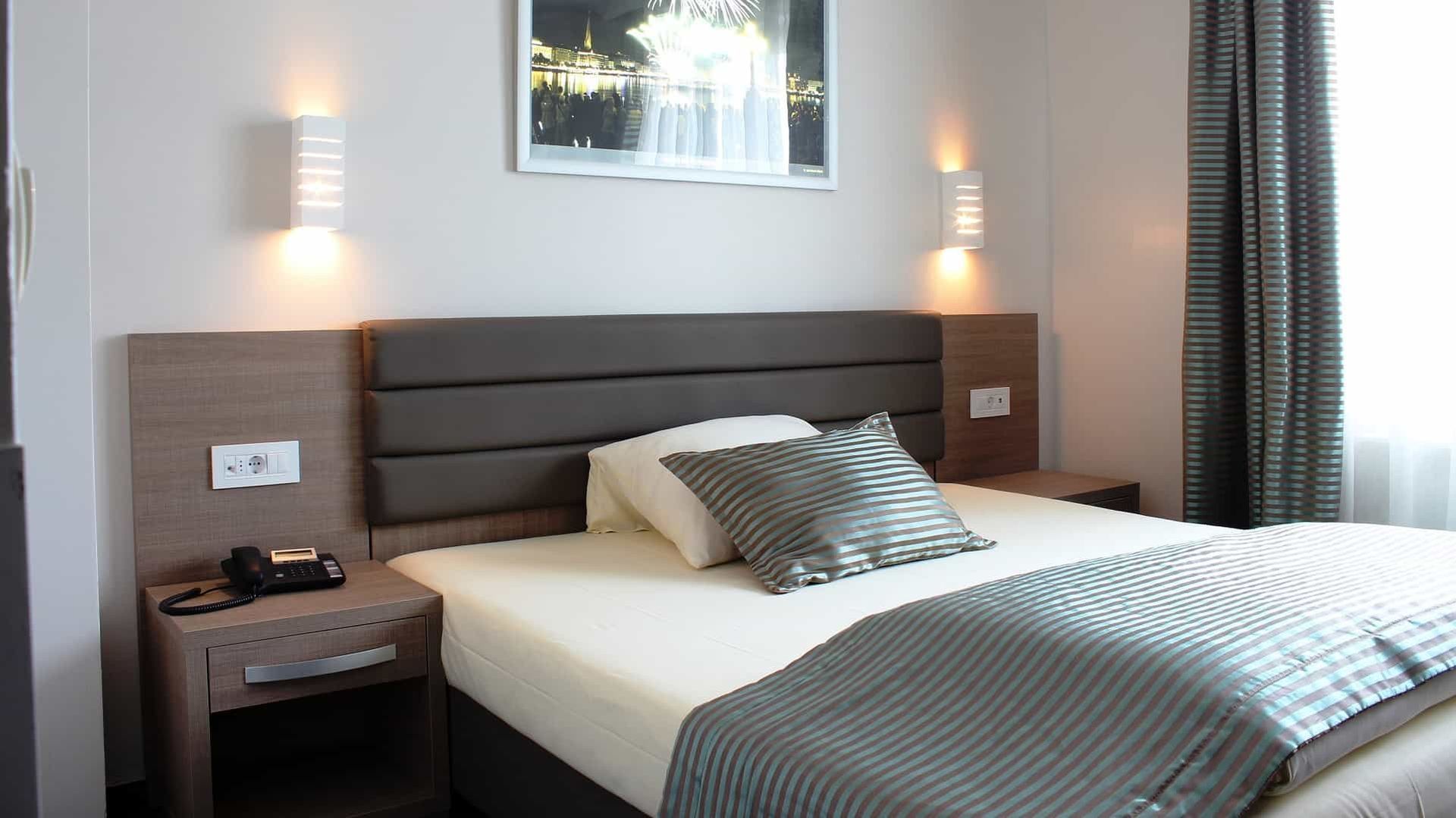 Großes (140 x 200 cm) Einzelbett. Jedes Zimmer hat ein eigenes Badezimmer, SAT-TV inkl. SKY Kanäle, einen Fön und Hotelsafe. Harmonisch aufeinander abgestimmte Farben lassen Sie ankommen und sich wie zu Hause fühlen.